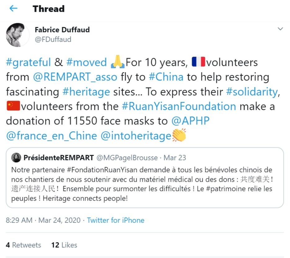 Fabrice Duffaud of Rempart illustrated this point beautifully on the webinar. For 10 years, Rempart has worked with the Ruan Yisan Foundation in China. Sharing volunteers on joint working holidays and other projects. Well, under Ding Feng’s leadership the Foundation is sending medical supplies to France, in an expression of solidarity. What a wonderful way to celebrate the INTO family!