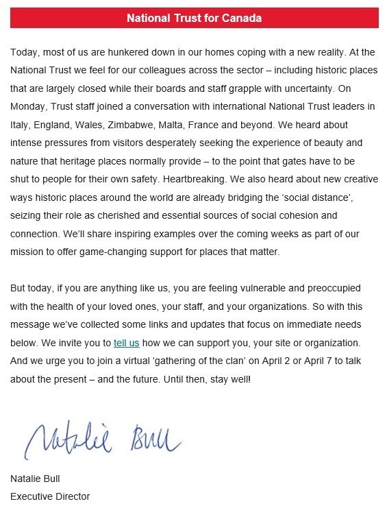 I had some good feedback after sharing the National Trust of Canada’s letter to ministers last week, so here are a couple of recent communications from other leaders of our global movement: